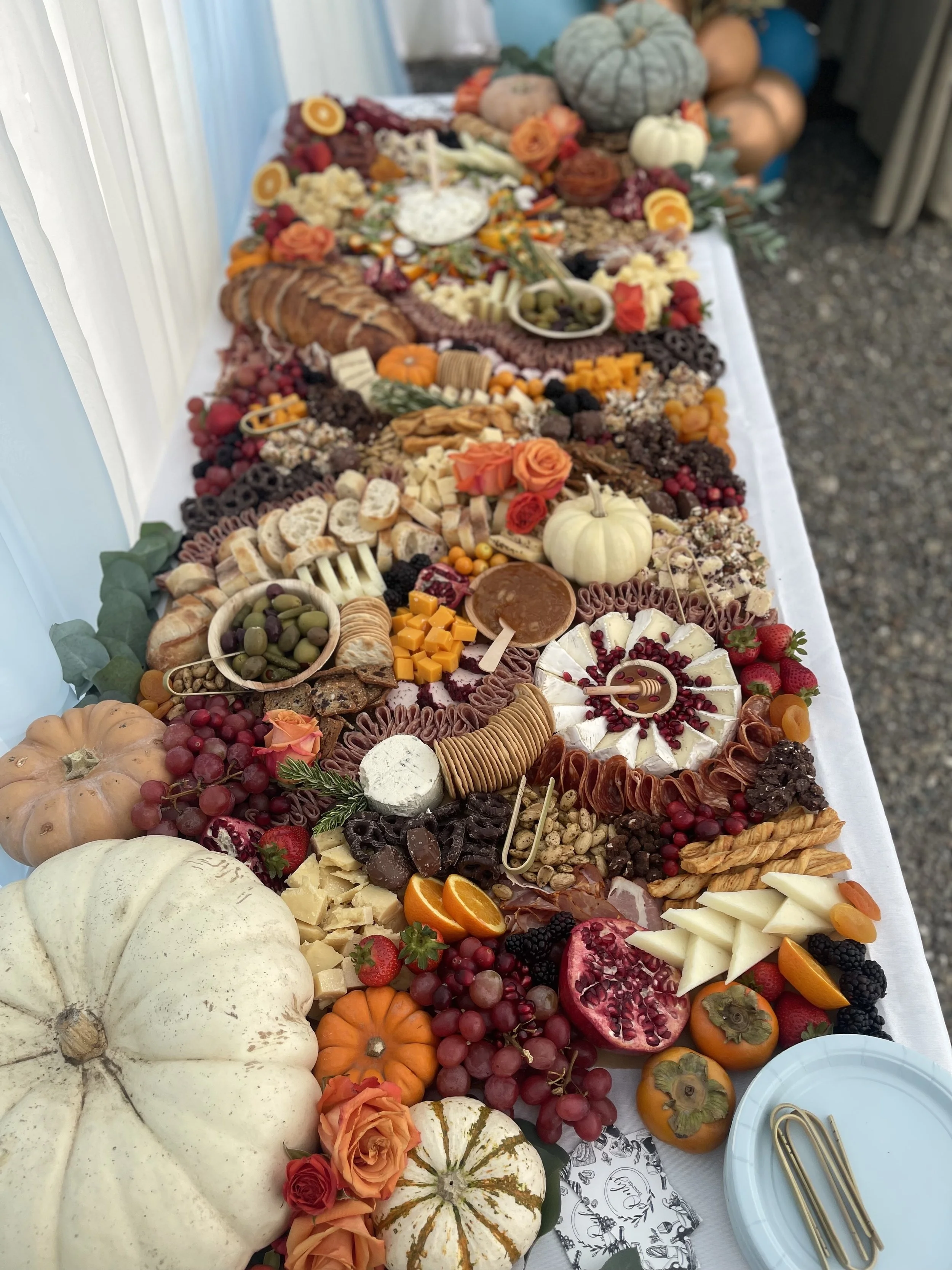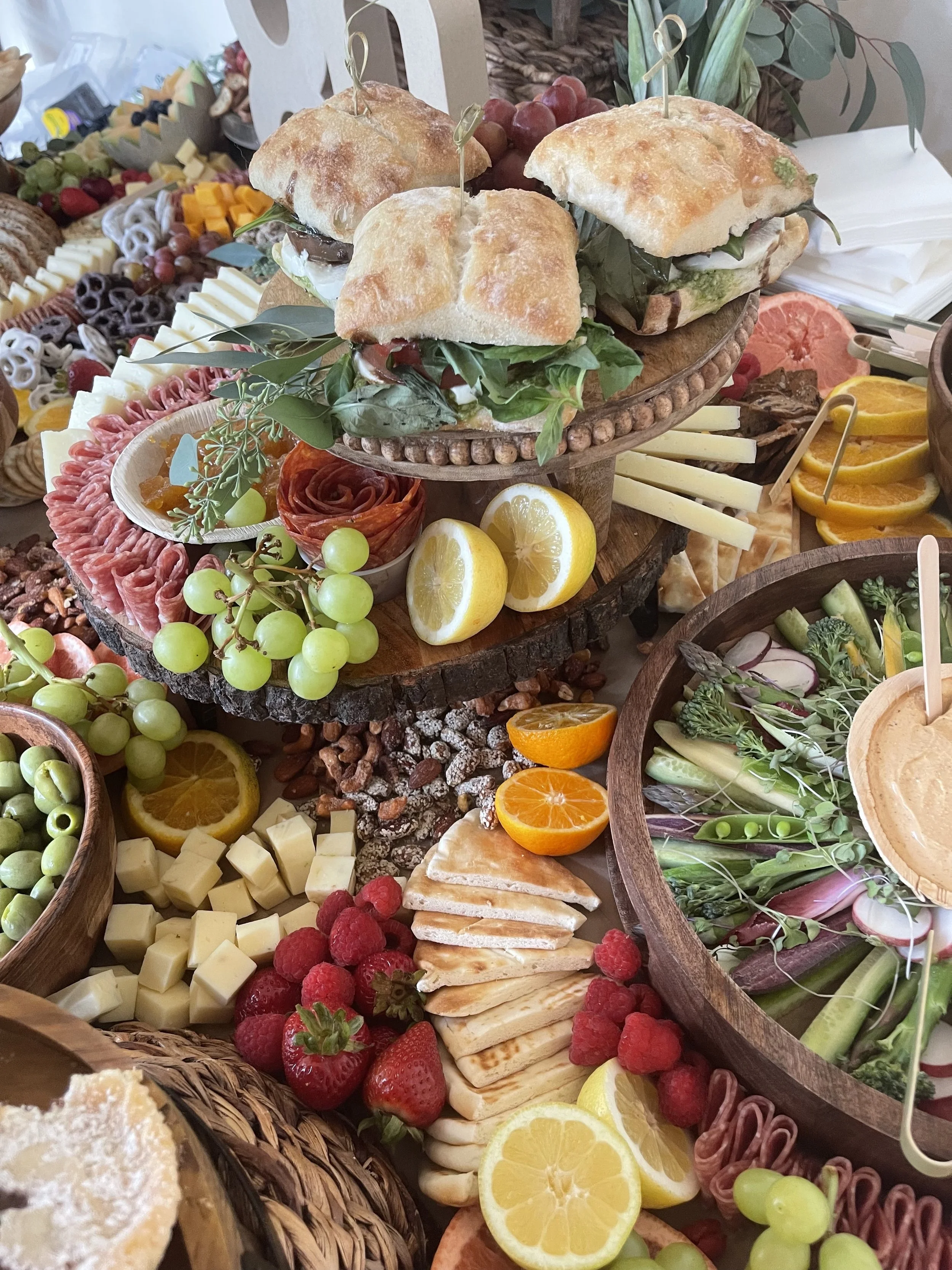 ALL grazes will include an assortment of cheeses and charcuterie, bread + crackers, crudités, fresh and dried fruits, Seasonal spreads, honey, olives/ pickled veggies, nuts, and other accouterments. Floral and greenery garnishes.