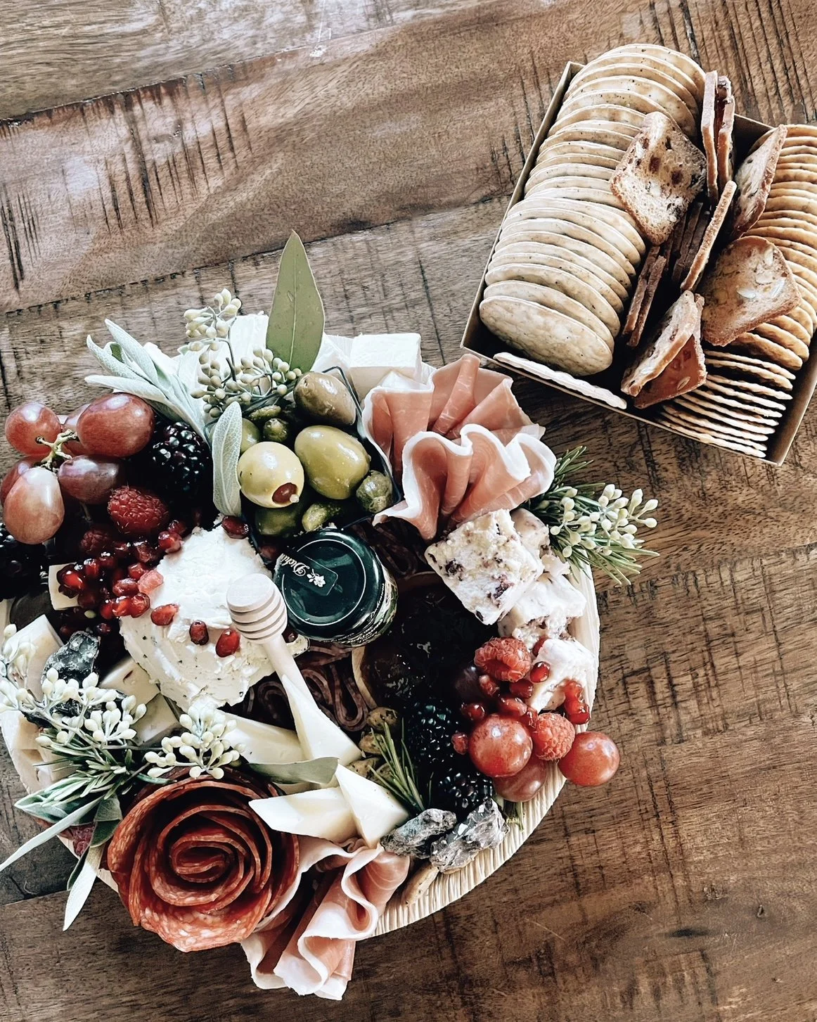 Includes 4-5 different meats, 6-7 different cheeses, olives and pickles, fresh and dried fruits, nuts and seasonal jam and honey jar, and chocolates. Crackers are packed on the side.